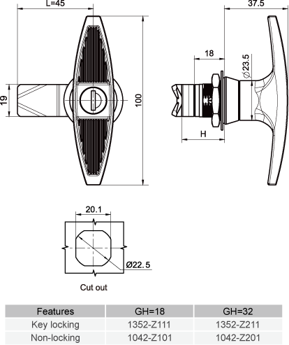 | Name: | Quarter turn latch 1352/1042,T-handle ,key locking/non-locking,zinc alloy,cam without stopper |
